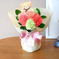 テーブルなどに飾りやすいサイズのスタンディングブーケです。愛らしいクマのピックが、ギフトに温もりを添えます。ラッピングの中にエコゼリー入りのブーケスタンドがセットしてあります。花瓶のご用意がいらずそのまま飾ることができます。大好きなお母さんへ「ありがとう」の気持ちを贈りませんか。商品のお届けが遅くなり夜間となる場合がありますこと、あらかじめご了承くださいませ。