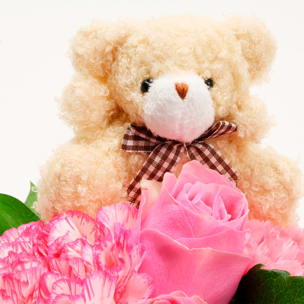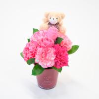 母の日のお花カーネーションや女性に人気のあるバラを使用したアレンジメントです。ガラスのようなプラポットにアレンジして花瓶のご用意がいらないので、キッチンやリビングなどにそのまま飾れます。愛らしいクマのピックが、ギフトに温もりを添えます。大好きなお母さんへ「ありがとう」の気持ちを贈りませんか。
