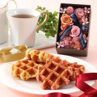 日比谷花壇のプリザーブドフラワーアレンジメントとマネケンのベルギーワッフルを組み合わせました。