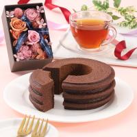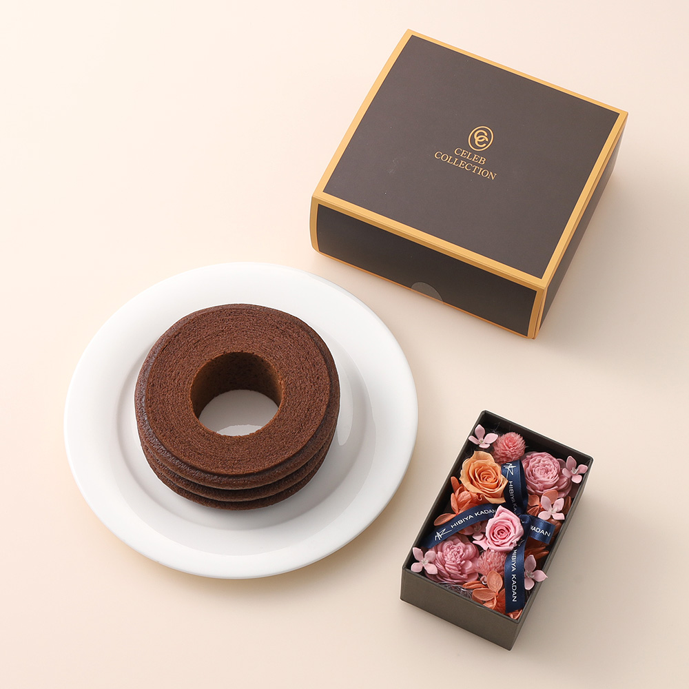 <日比谷花壇>人気のある柔らかなピンクに明るいビタミンカラーの花々を上質なグレーのボックスにデザインしました。<セレブコレクション>高級感のあるパッケージに、丁寧に焼き上げたバームクーヘンです。定番のバームクーヘンをショコラ風味で仕上げました。