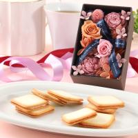 <日比谷花壇>人気のある柔らかなピンクに明るいビタミンカラーの花々を上質なグレーのボックスにデザインしました。<銀座千疋屋>薄くさっくりと焼き上げたクッキーにメロン、いちごのチョコレートをサンドしました。
