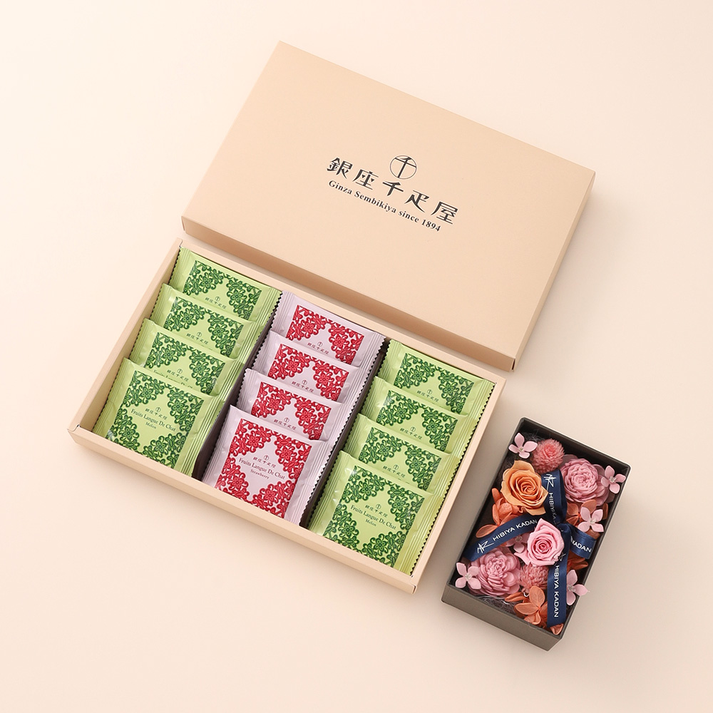日比谷花壇のプリザーブドフラワーアレンジメントと銀座千疋屋のフルーツラングを組み合わせました。