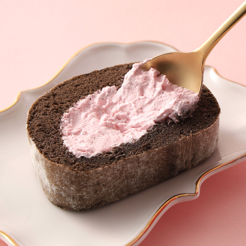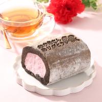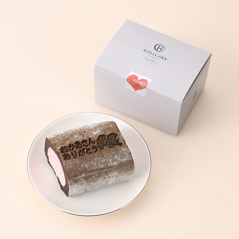 【冷凍便でお届けします。解凍まで時間がかかりますのでご注意ください。】『おかあさんありがとう』の焼印メッセージを入れたハーフサイズのロールケーキ。ビターなブラックココア生地で、ほろ甘い苺のクリームを一巻にしました。
