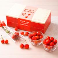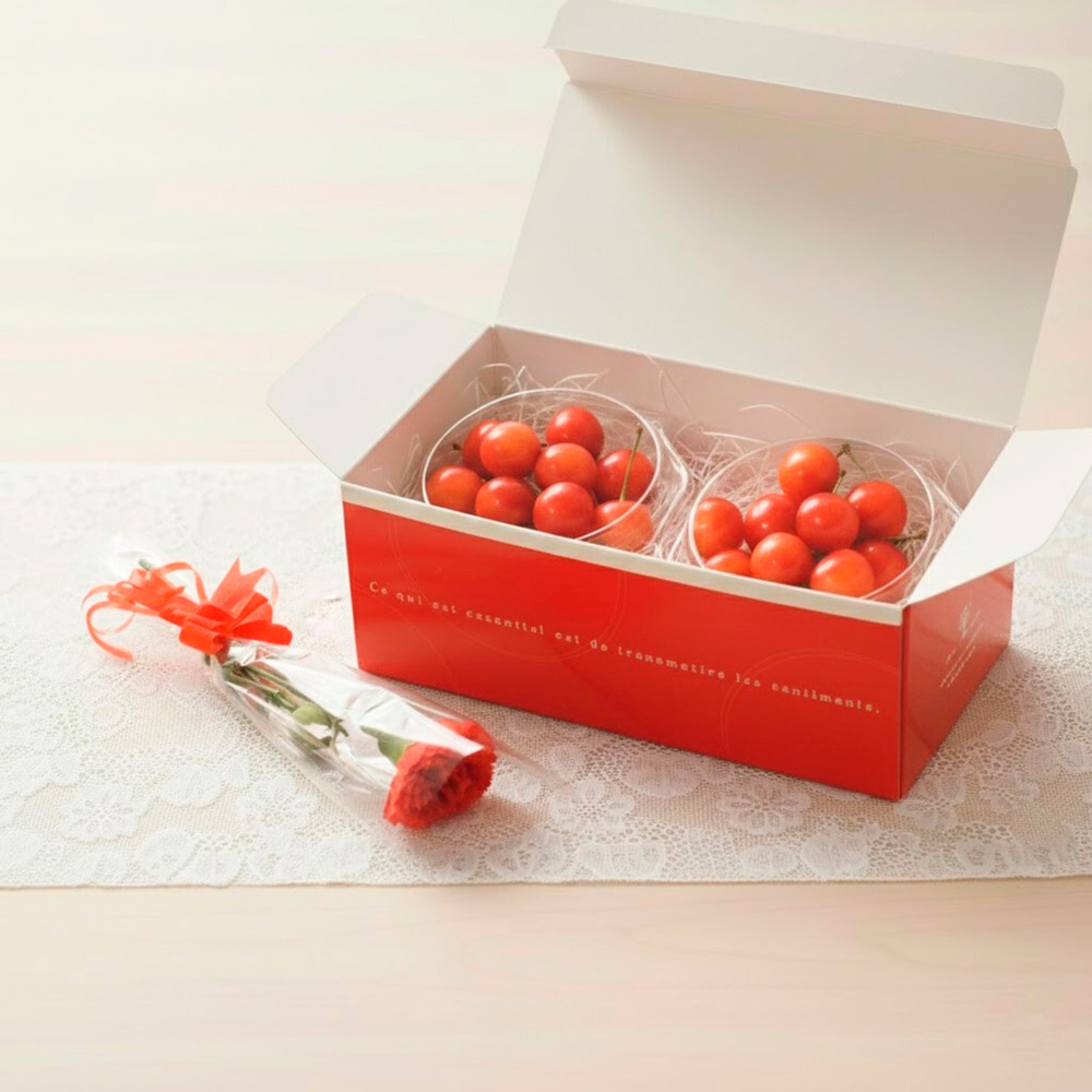 国産さくらんぼ(Lサイズ)100g×2(山形県もしくは山梨県)、カーネーション(造花)×1 ※カーネーションのタイプが変わる可能性がございます。