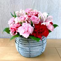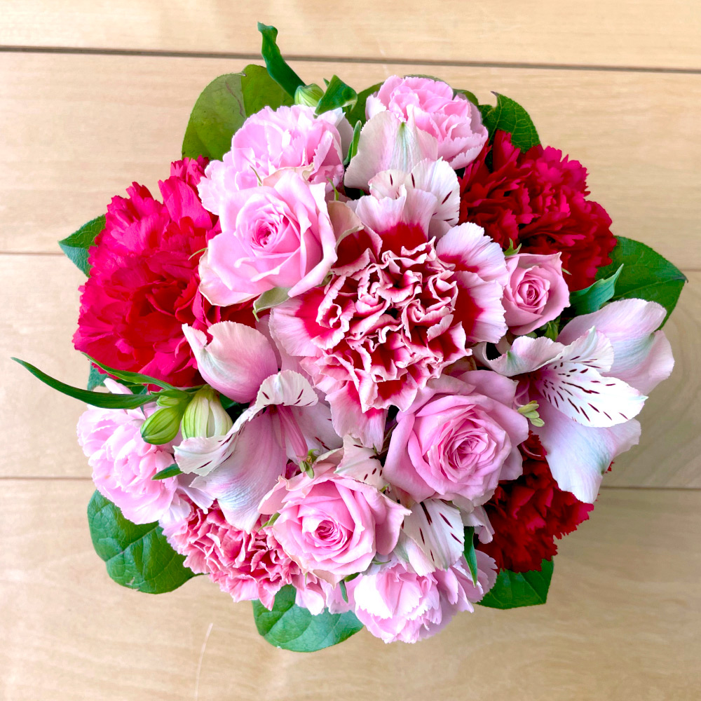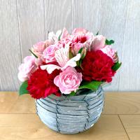 花材:ミニバラ、カーネーション、スプレーカーネーション、アルストロ、葉もの