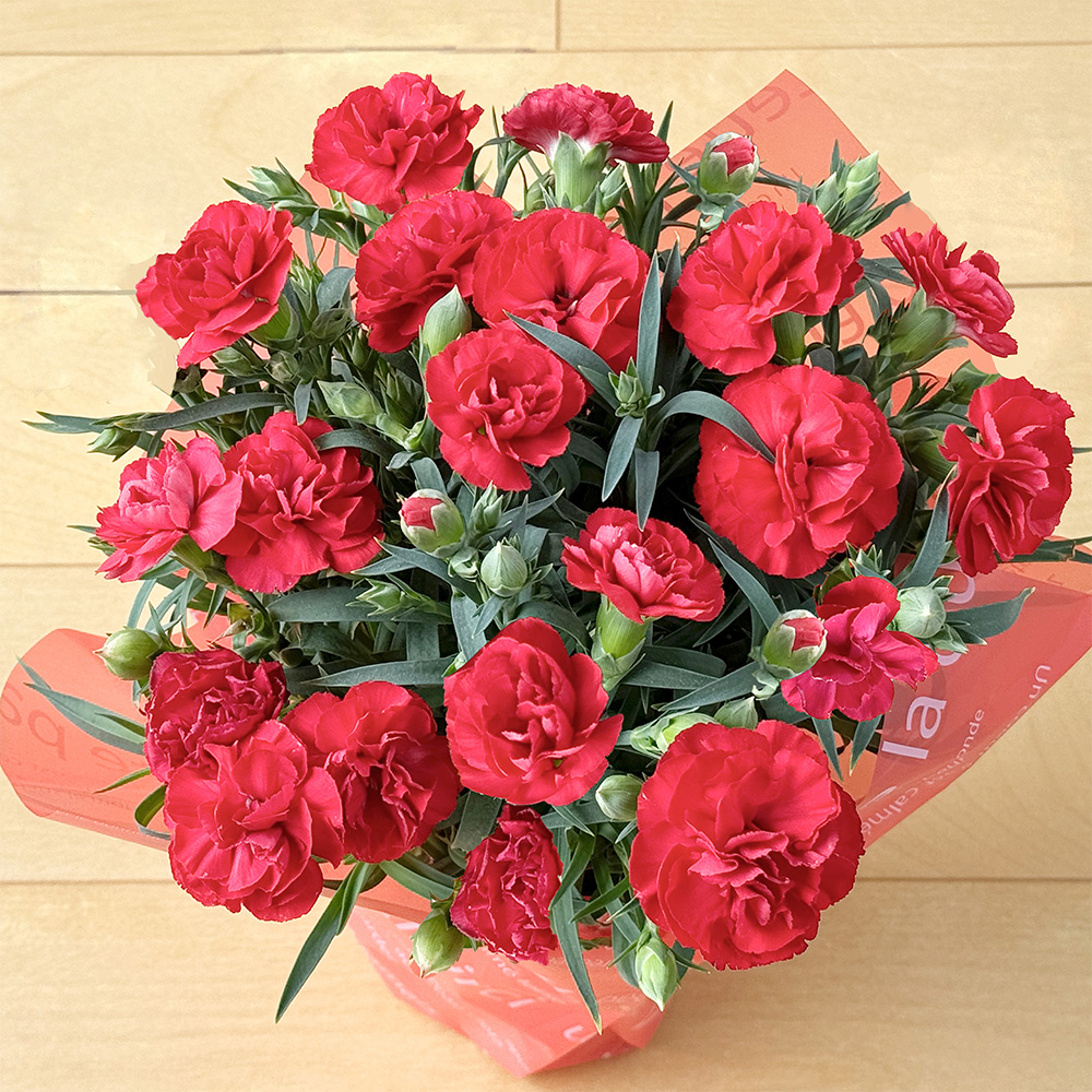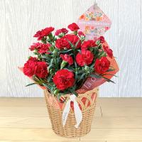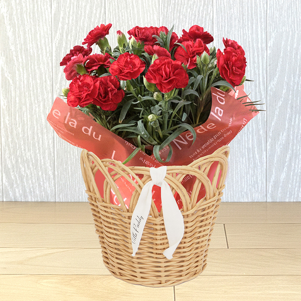 育てる楽しさもあわせて贈れる赤色カーネーションの鉢植えです。鉢底の直径が約12cmのサイズです。すかし編みが今っぽいバスケットは、水洗いもでき、扱いやすいポリプロピレン製です。しばらく楽しんだ後は植え替えたり、地植えにしたり長く楽しむことができます。ガーデニングが好きなお母さまにおすすめのギフトです。