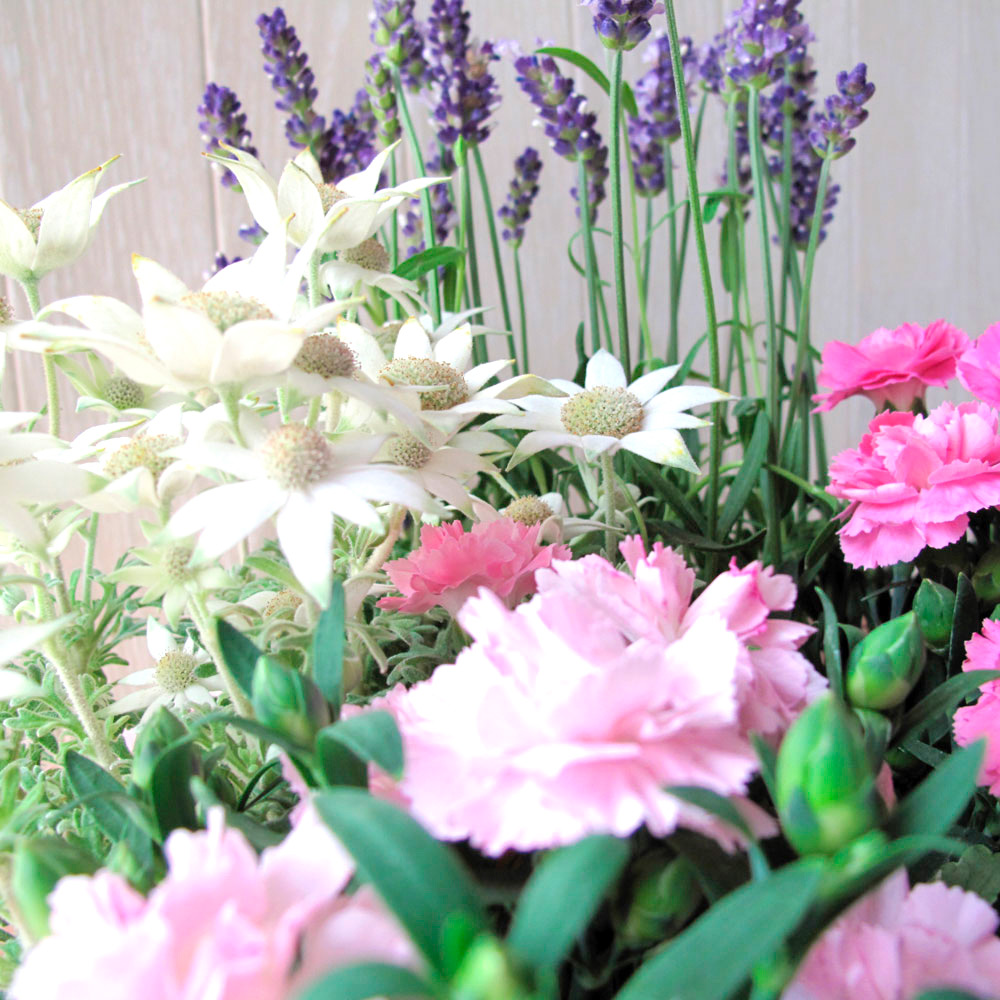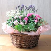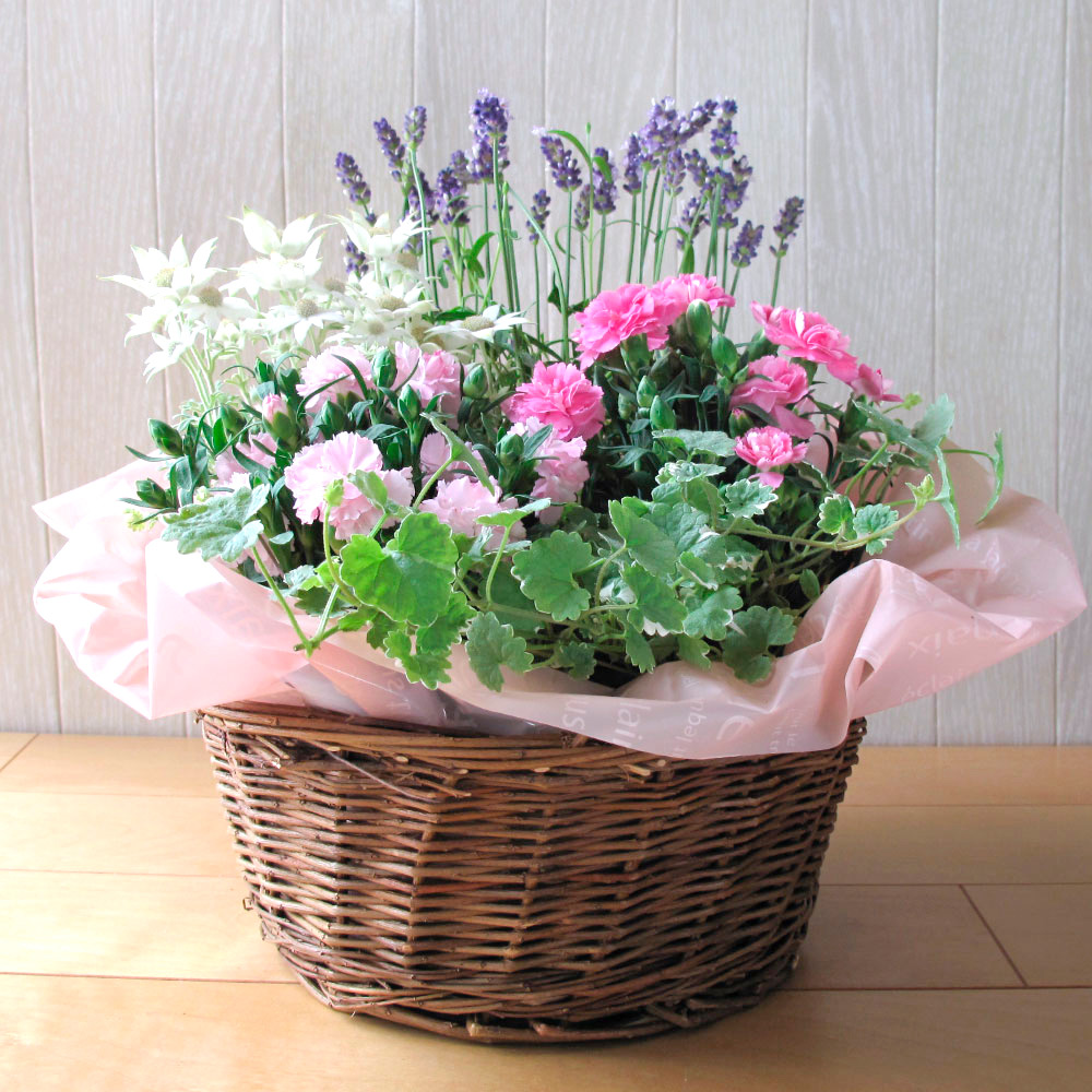ミニカーネーションをメインにさわやかな香りのグレコマやラベンダーをバスケットに寄せたギフトセットです。しばらく楽しんだ後は植え替えたり、地植えにしたり、育てて楽しむことができます。ガーデニングや庭いじりが好きなお母さんにおすすめのギフトです。