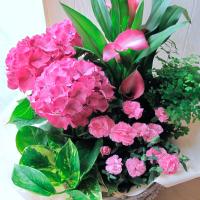アジサイやカラー、ミニカーネーションをメインに季節のポット苗をバスケットに寄せたギフトセットです。しばらく楽しんだ後は植え替えたり、地植えにしたり、育てて楽しむことができます。ガーデニングや庭いじりが好きなお母さんにおすすめのギフトです。