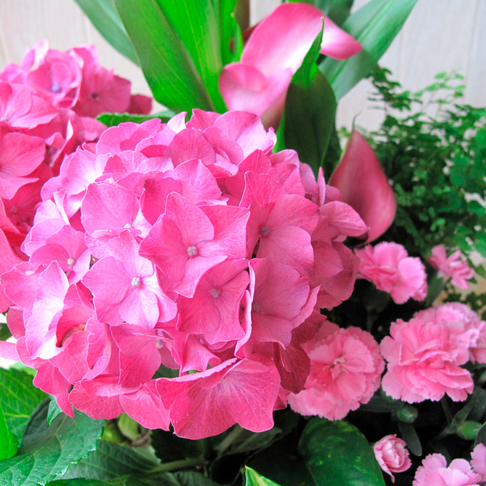 花材:カーネーション、カラー、アジサイ、葉もの等