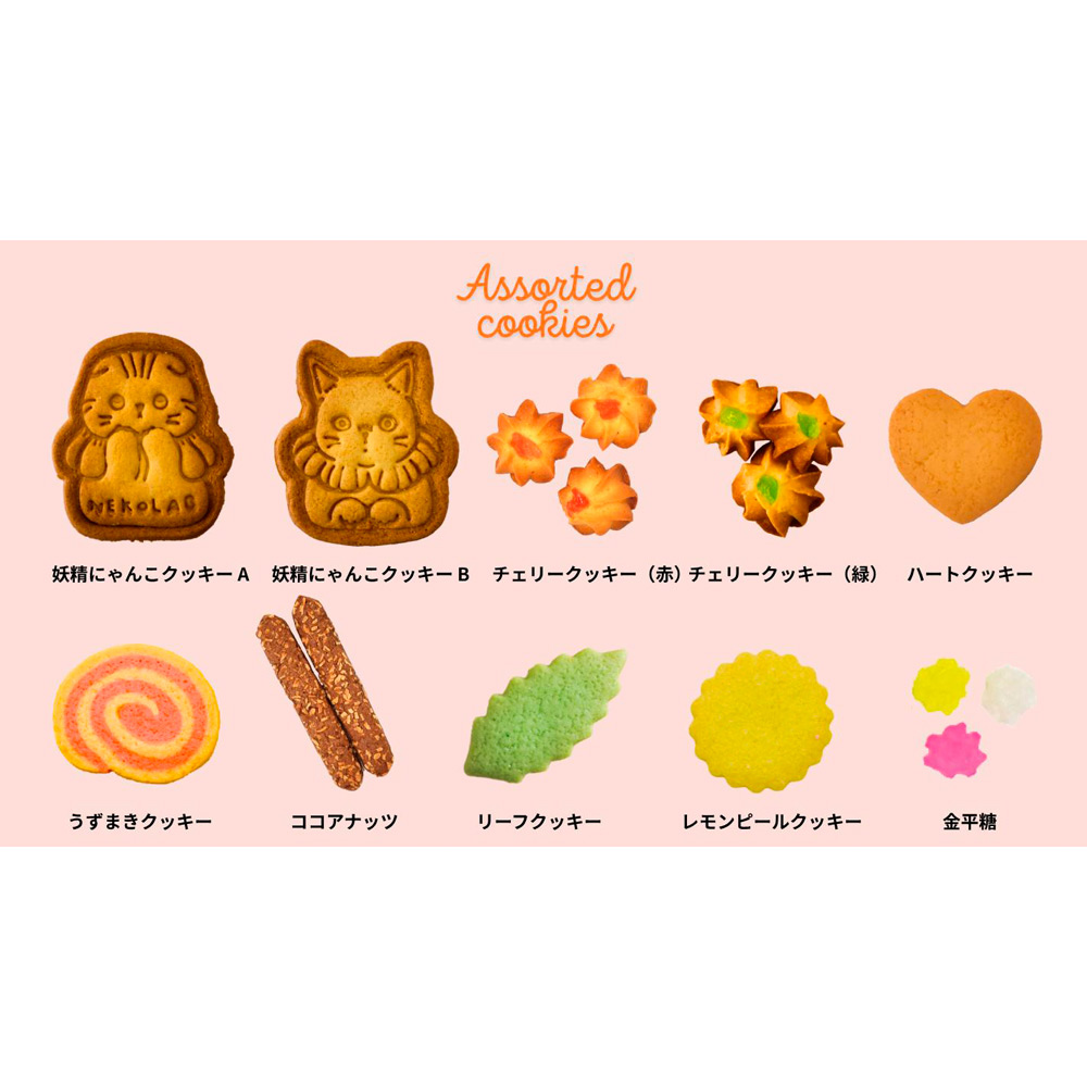 妖精にゃんこクッキーA4枚、妖精にゃんこクッキーB4枚、ピンクうずまきクッキー4枚、ハートクッキー4枚、ココアナッツ2枚、レモンピールクッキー4枚、リーフクッキー7枚、チェリークッキー赤6枚、チェリークッキー緑6枚、金平糖6個