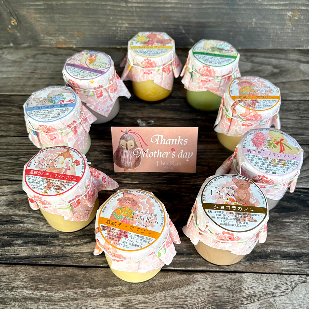 小さな店舗で夫婦二人、数えきれない試作を通じて生まれた笑顔と幸せを運ぶ手作りプリン。母の日専用にデザインしたカーネーション他それぞれのテーマカラーの花束を抱えた可愛い動物たちのパッケージでお届けします。
