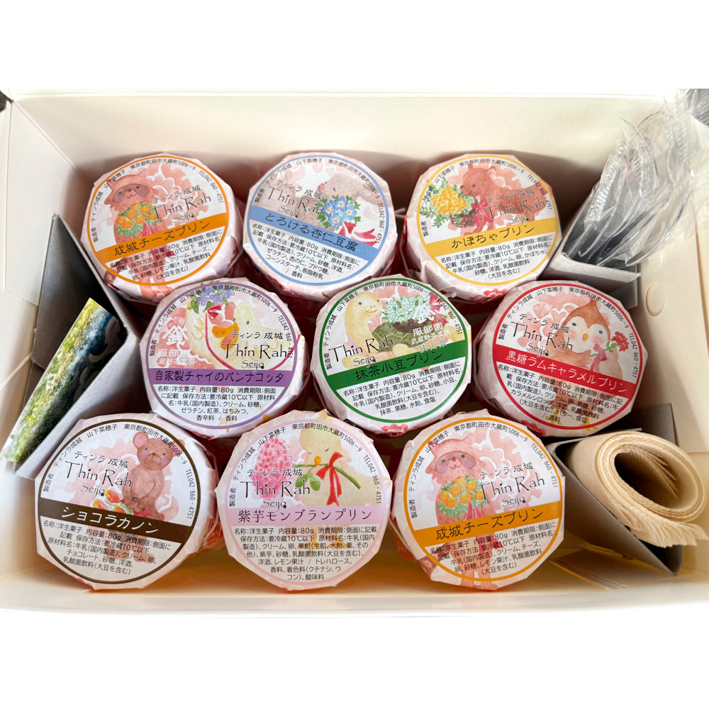 成城チーズプリン×2、とろける杏仁豆腐×1、かぼちゃプリン×1、自家製チャイのパンナコッタ×1、抹茶小豆プリン×1、黒糖ラムキャラメルプリン×1、ショコラカノン×1、紫芋モンブランプリン×1 計9個