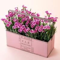 小さく可愛い花がたくさん咲くガーデンカーネーション(ピンクキッス)4株をヴィンテージ調のブリキ製の鉢に入れました。