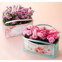 2種のガーデンカーネーション(アイラブユー、ピンクキッス)3株ずつを取り替え可能なパステルカラーのミニバッグ2セットでお届けします。