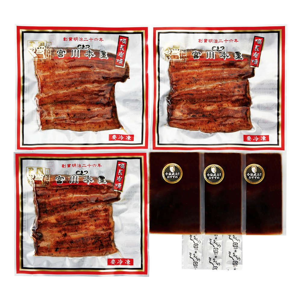 備長炭焼鰻蒲焼110g×3、小泉武夫監修特製たれ20g×3、山椒3袋 ※電子レンジ対応(鰻) ※鰻の仕上りにより形状が異なります。 原料原産地:鰻(国産)