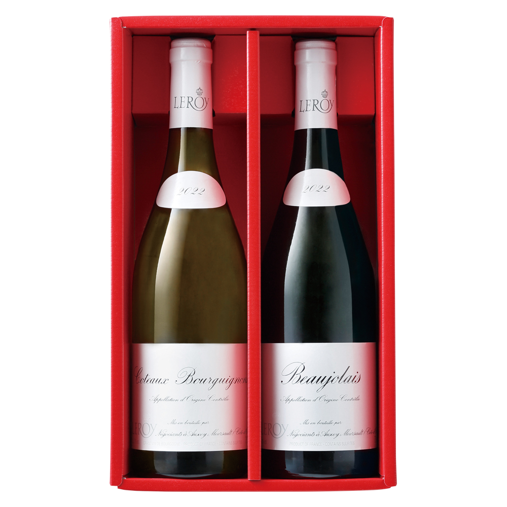 フランス・ブルゴーニュを代表する〈ルロワ〉の紅白ワインです。ガメイ種の赤ワインは、ストロベリーなどの赤い果実が香り、ジューシーで軽やかな味わい。シャルドネ種の白ワインは、フルーティーな香りとふくよかな果実味、なめらかな酸の絶妙なバランスが特徴です。