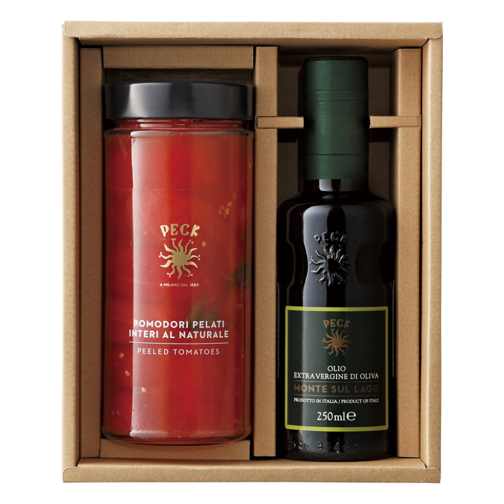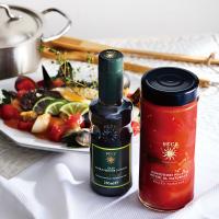 さまざまな料理に使えるエクストラバージンオリーブオイルと、南イタリア・プーリア地方で手摘みされたホールトマトのセットです。