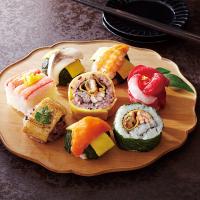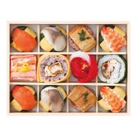 手鞠わさび葉寿し:鮭・鯖・海老各2、古代あなら寿し×2、紅ずわいがに棒寿司、古代巻、紅白華手鞠、わさび巻 ※電子レンジ対応 原料原産地:鰻(国産)