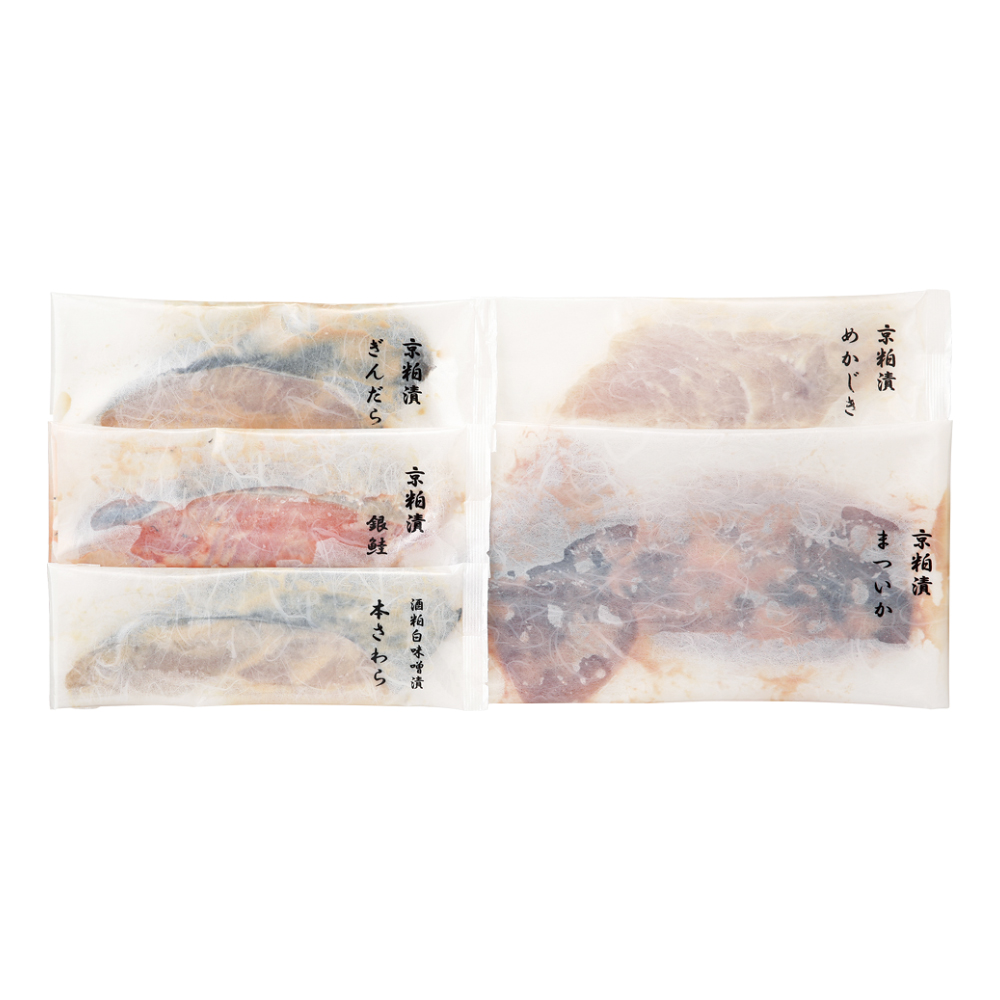 京粕漬:ぎんだら75g、銀鮭・めかじき各80g、まついか110g、酒粕白味噌漬:本さわら80g