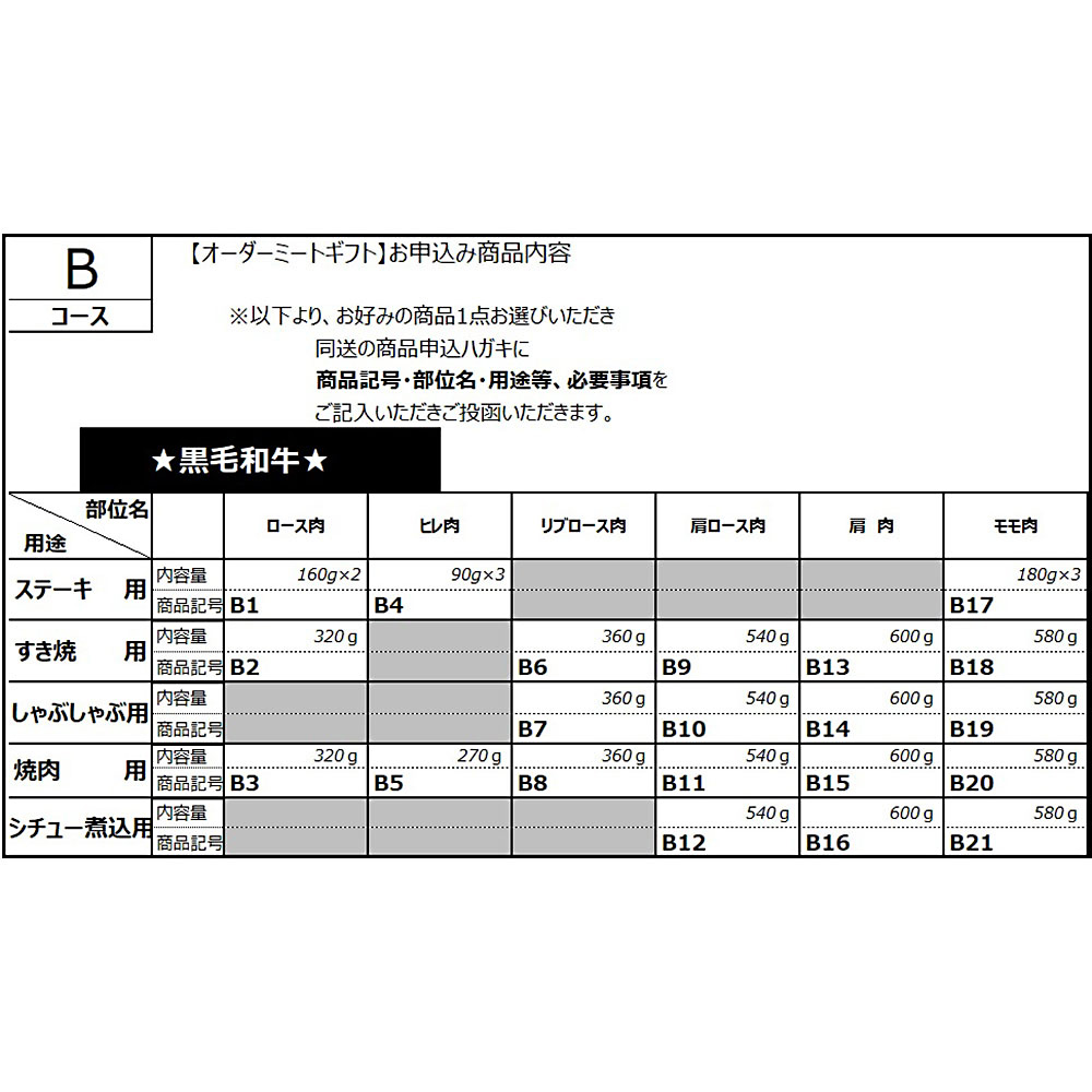 下記のうち用途にあわせた部位・カッティングをお選びいただけるパンフレットとお申込みハガキをお届けします。
