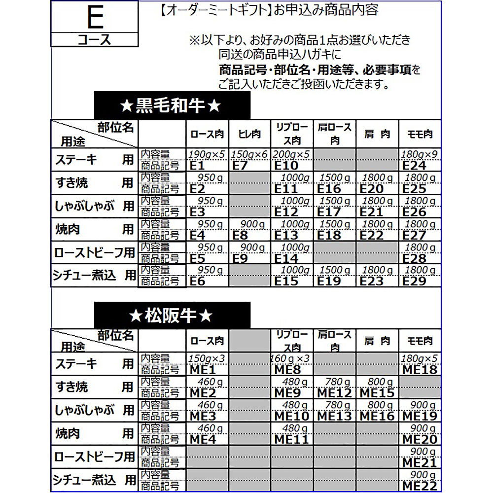 下記のうち用途にあわせた部位・カッティングをお選びいただけるパンフレットとお申込みハガキをお届けします。