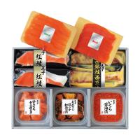 スモークサーモンスライス(フィヨルド・紅鮭)各50g、あわびと数の子松前漬70g、いくら醤油漬50g、ひとくち明太子70g、銀鮭西京漬60g×2、紅鮭切身60g×2