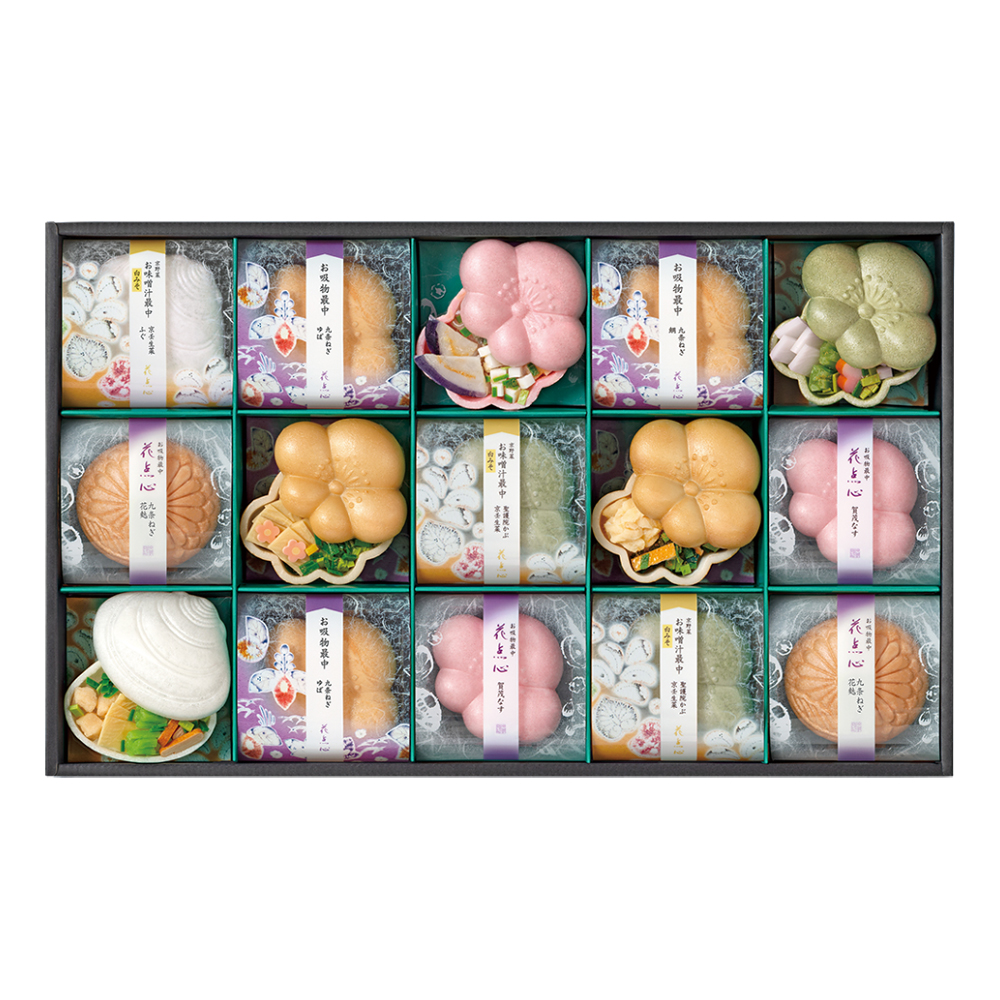 九条ねぎ(ゆば)・聖護院かぶ(京壬生菜)・賀茂なす各3、九条ねぎ(鯛)・京壬生菜(ふぐ)・九条ねぎ(花麩)各2