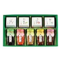 ちりめん山椒30g、焼き紅鮭43g、海老わかめ65g、木耳山椒55g、牛肉おぼろ煮・深山椎茸各60g、ちりめんくぎ煮・梅ひじき・しば漬ちりめん各50g