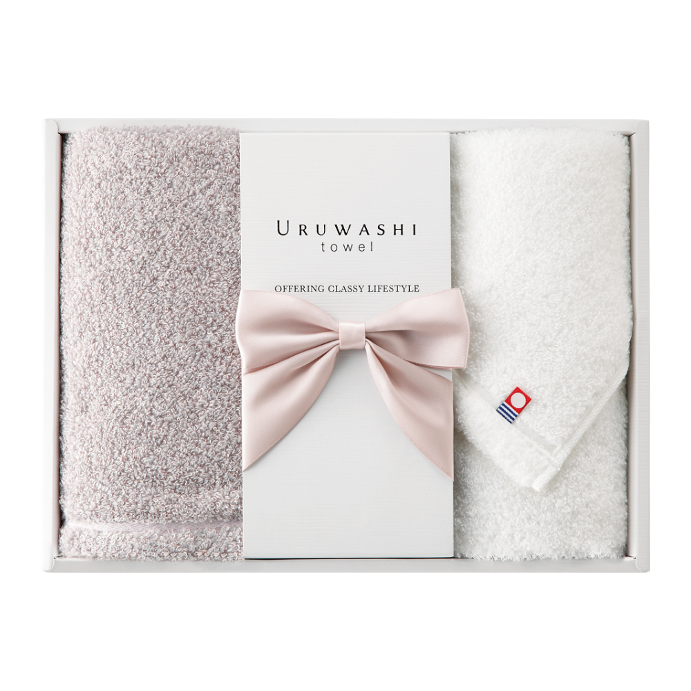 使い心地にこだわり、撚りをかけた糸と無撚糸を交織して使用。吸水性が良く、やわらかな風合いに織りあげた今治タオルです。上質・品格・エレガンスをキーワードに、品のあるプレーンなデザインにしています。色合いは2色の先染め糸を淡いエレガンストーンでまとめ、アイキャッチに上品さを演出するサテンリボンを施し、華やぎのあるギフトセットに仕上げました。日々の暮らしの風景に美しさを添える、贈られた方々に喜んでいただけるギフトです。
