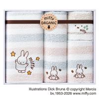 パイル糸にオーガニックコットンを使用した、ふんわりとした感触のタオルです。シンプルなボーダー柄にミッフィーの刺しゅうがアクセントを添えています。