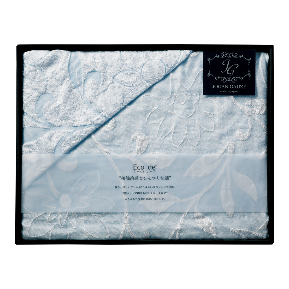 ひんやりと心地よい肌ざわりのガーゼケット。接触冷感のクール糸を使用してリーフ柄を織り上げました。