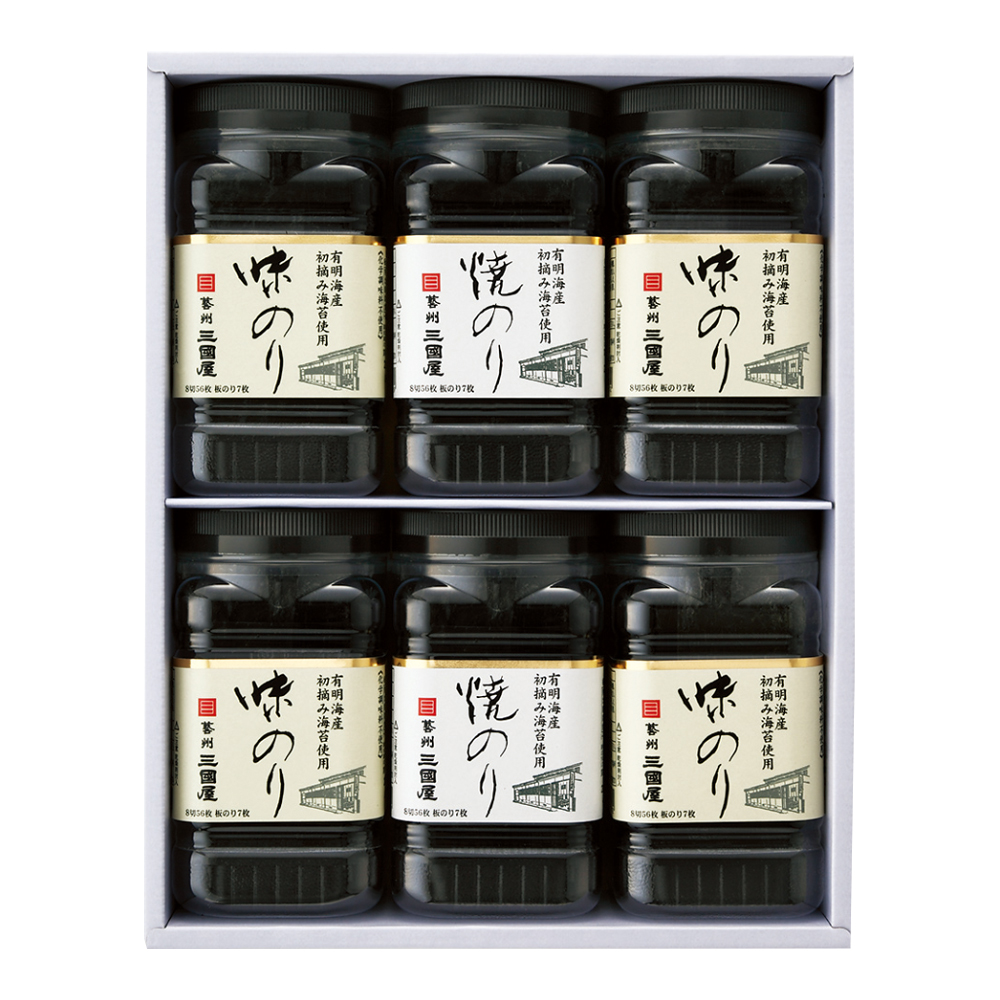 有明海産の一番摘み海苔を丁寧に焼きあげた「焼のり」と、かき煮汁・干えび・昆布などを使って仕上げた「味のり」を詰め合わせました。