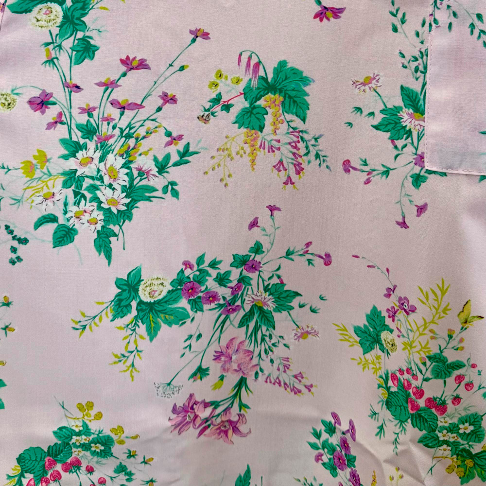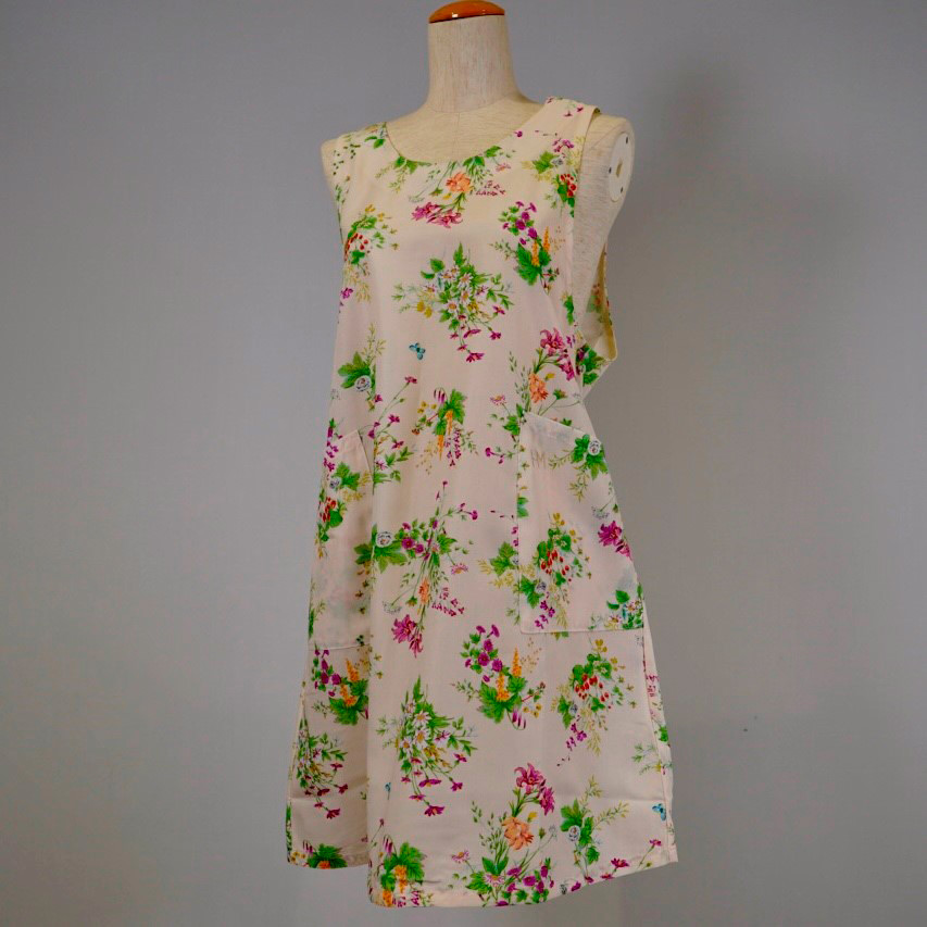 HANAE MORIのヴィンテージデザインをアレンジしました。蝶と共に咲き誇る花々と、庭園に実るイチゴや葡萄など華やかさと豪華な雰囲気が漂います。素材は綿のような感覚のポリエステルでイージーアイロンなのも魅力です。後ろの腰紐でシェイプさせることが可能で、スレンダーに着用させたり緩めてゆったりと着用する事が出来る仕様となっております。肩紐がズレ落ちる、といった心配のない背付きエプロンは、人気のアイテムです。蝶と共に咲き誇る花々と、庭園に実るイチゴや葡萄など華やかさと豪華な雰囲気が漂います。