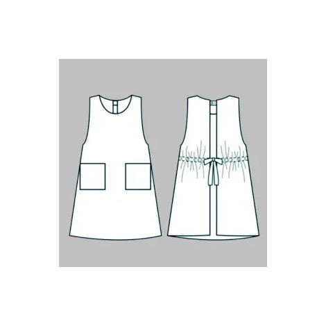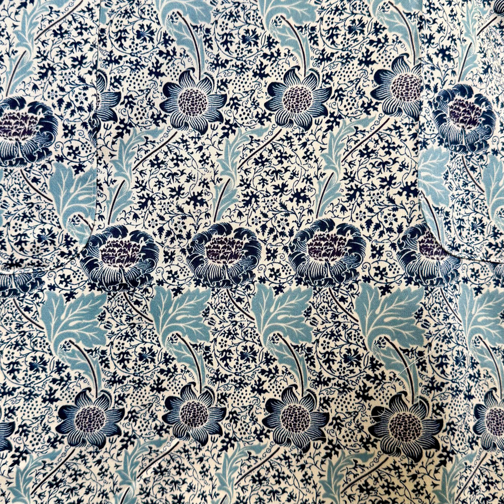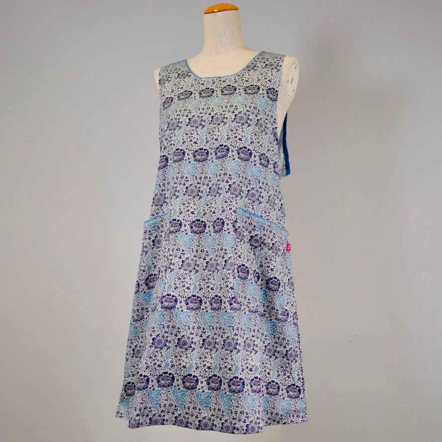 ウィリアム・モリスによる「ケネット」の柄。小さなカールしたブドウの木を背景に、ひまわりの茎とアカンサスの葉のパターンを繊細にプリントしました。無地染めジャガードとの組み合わせと、落ち着いたトーンのカラーリングが魅力のエプロンです。後ろ身頃のある背付きのデザインは、肩紐が落ちることなく着心地の良さから人気のデザインです。腰紐が絞れる仕様で、ゆったりと着用したりキュット絞ってフィットさせたりと気分に合わせて調節が出来る点も魅力です。