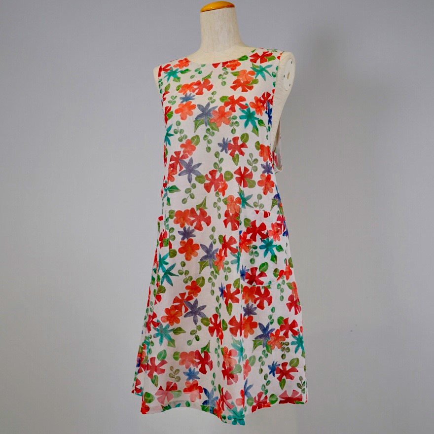 フラワーモチーフを伸び伸びとしたタッチで表現した、シビラの魅力が溢れるテキスタイル。部分的に透ける「オパール加工」を施した生地は、透明感があり涼しげなエプロンです。ウエストリボンでサイズ調整が可能な背付きタイプのエプロンです。