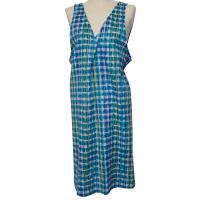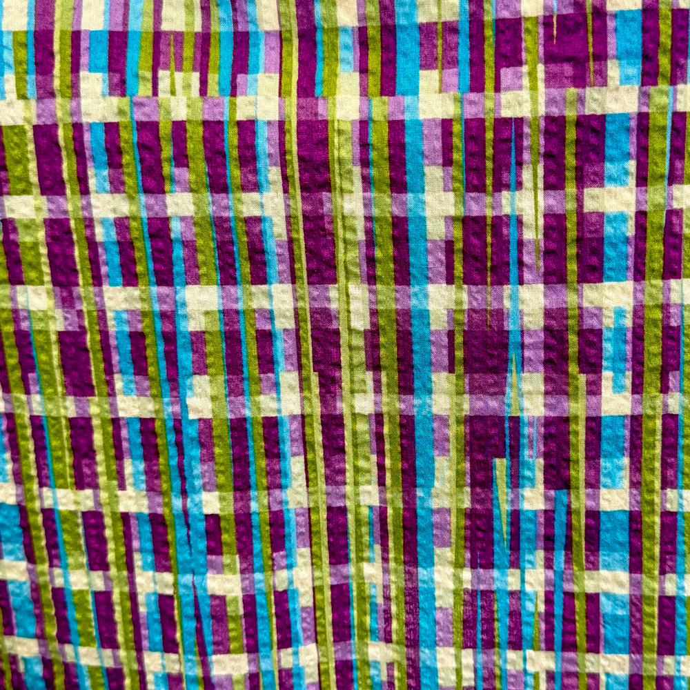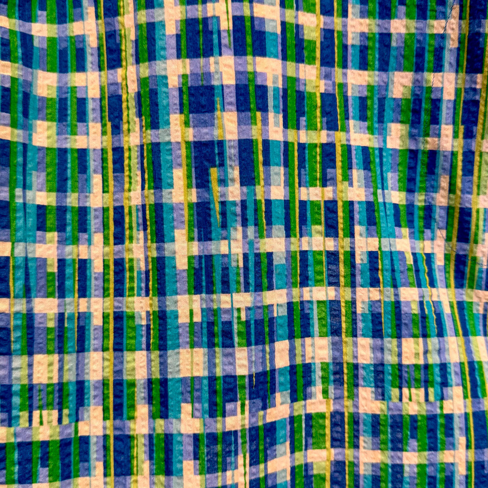 リズミカルな変形チェック柄を、リップル加工で立体的に表現した明るくてPOPなテキスタイルのエプロンです。薄手の綿素材で肌離れも良く、暑い時期にもおすすめな素材です。デザインではタックを入れたVネックで、顔まわりもスッキリ見えます。サイズ調整のし易い上下紐結びタイプの背付きエプロンになります。