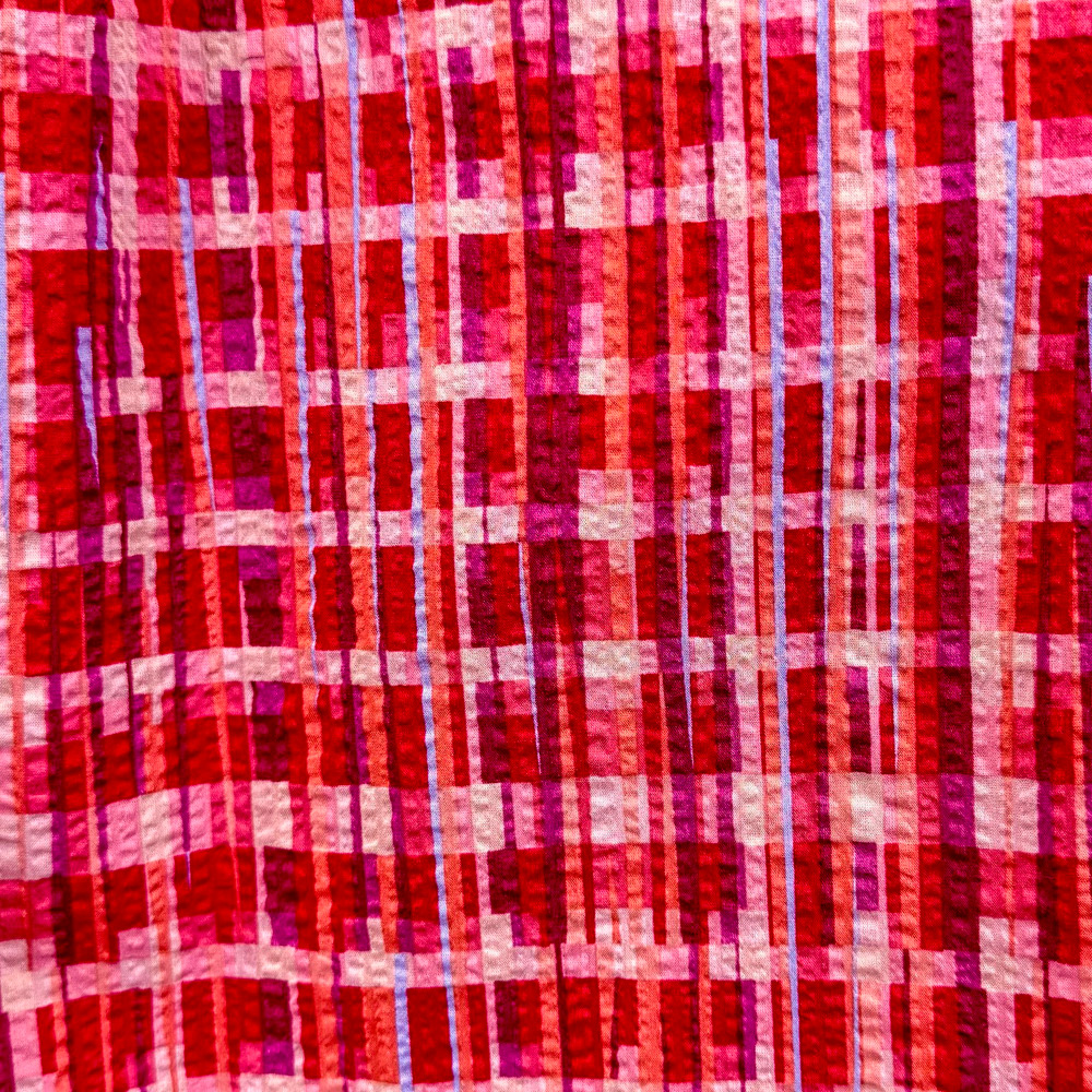 リズミカルな変形チェック柄を、リップル加工で立体的に表現した明るくてPOPなテキスタイルのエプロンです。