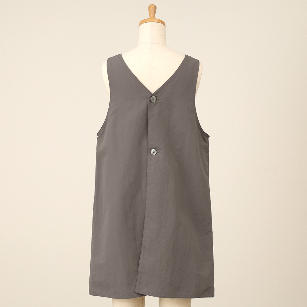 カジュアルなナイロン素材とモダンなカラーを組み合わせたエプロン。背中までカバーしたチュニック風のデザインは肩がずれにくく人気のデザインです。