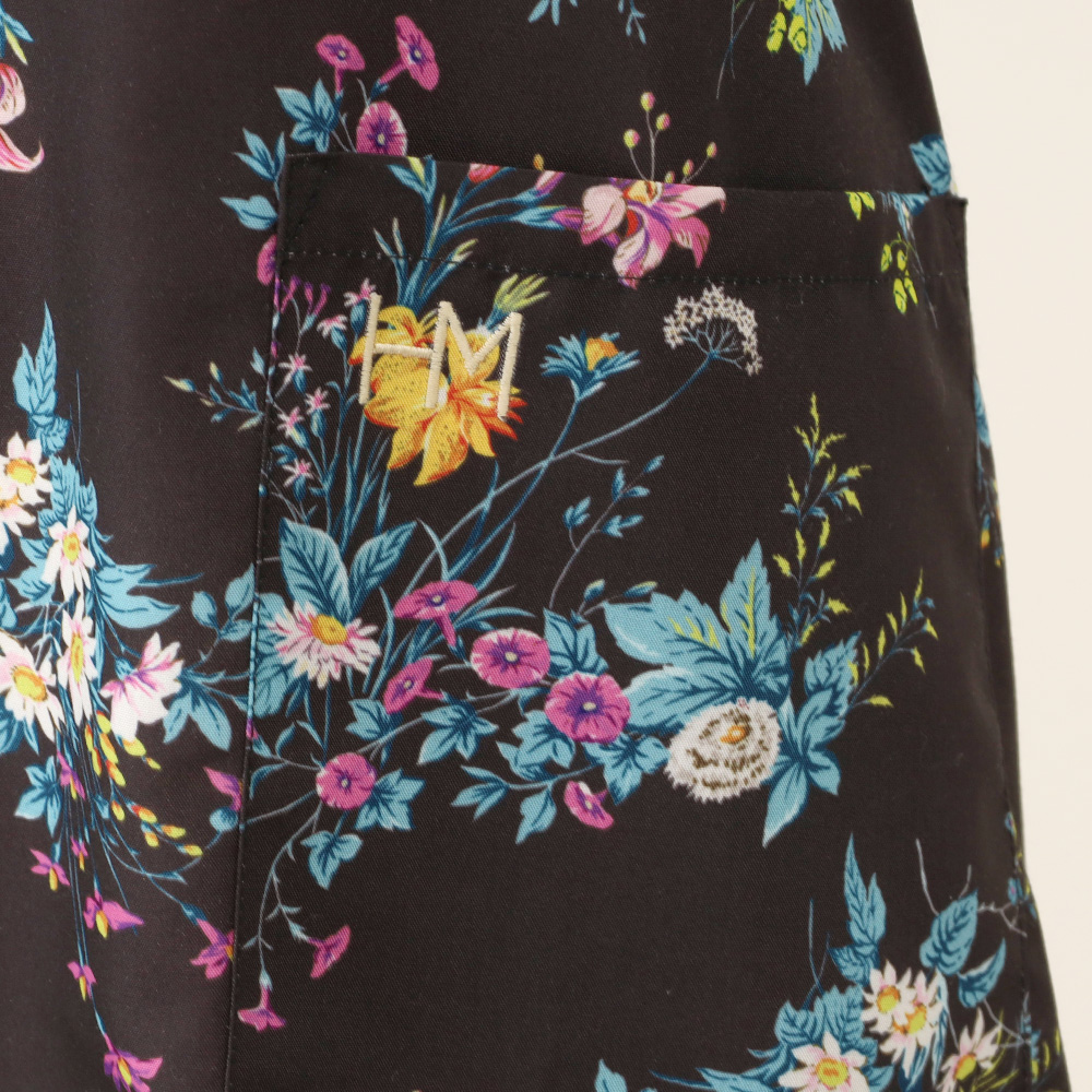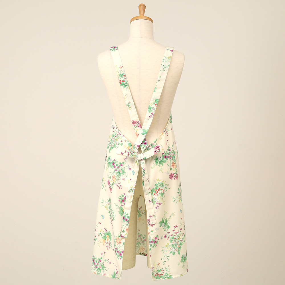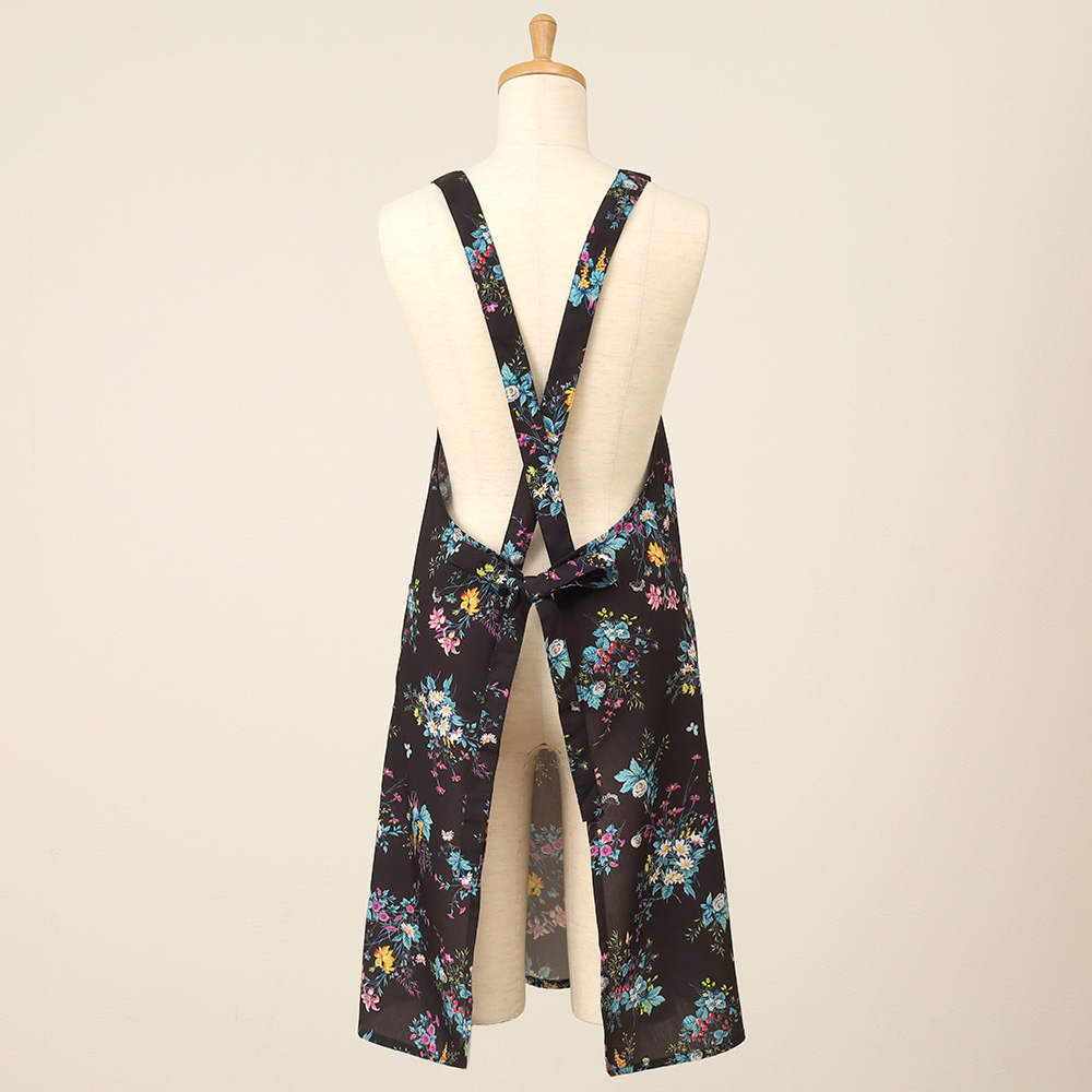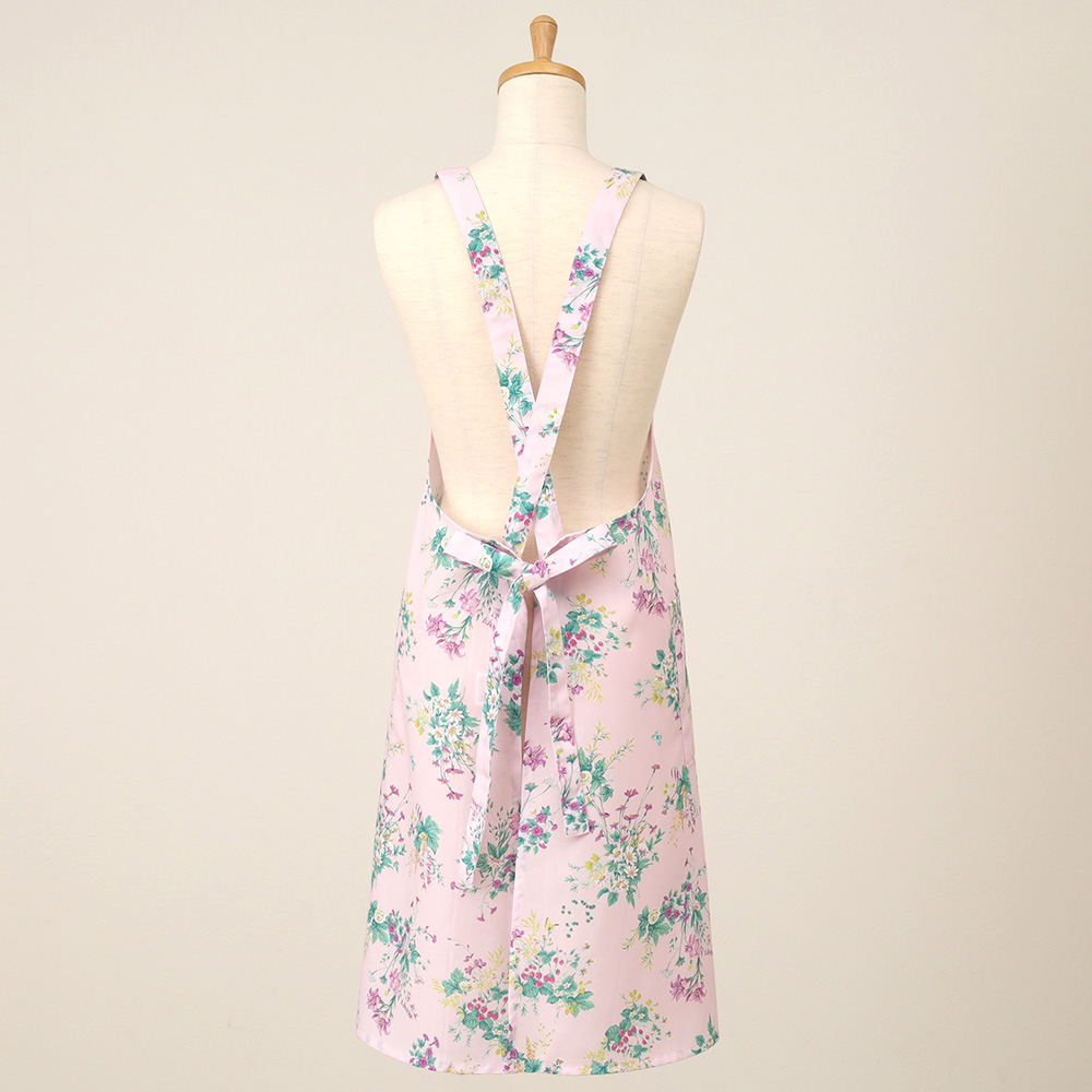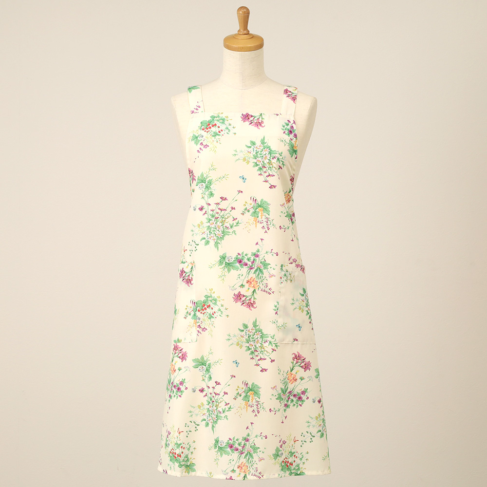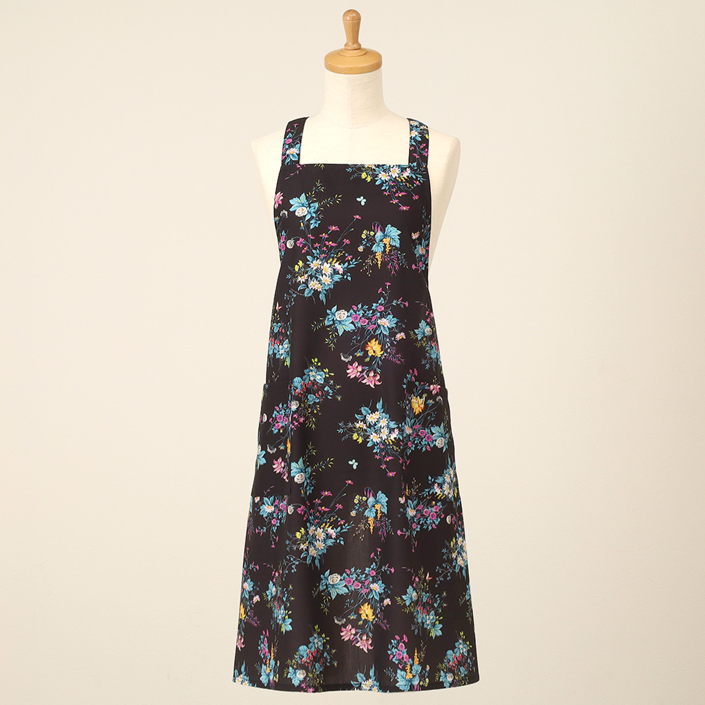 色彩豊かで華やかなフラワーブーケをプリントで表現したエプロン。コットンライクのポリエステル素材はシワになりにくく、ケアも用意。プレゼントにもおすすめな一枚です。