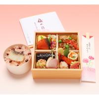 <一人前>すき焼き、出汁巻玉子、鮭柚庵焼、蛸バジルソース、有頭海老旨煮、絹さや、穂付筍土佐煮、花麩、三色信田巻、かにボール、茄子揚げ浸し、合鴨ロース串打ち、蓮根揚げ、わっぱ飯(鯛赤飯)、ごましお