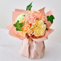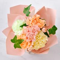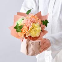 <日比谷花壇>デザイナー西澤真実子さんが特別にデザインしたこのブーケは、太陽のようなイエローと温かなオレンジのカーネーションを主役に、清々しいグリーンでまとめた、見ていて心が弾むカラーリングです。お手入れが簡単な「そのまま飾れるブーケ」なら、受け取ってすぐに明るい彩りをお部屋に添えていただけます。感謝の気持ちと明るい未来への願いを込めて、特別な花束を贈りませんか。