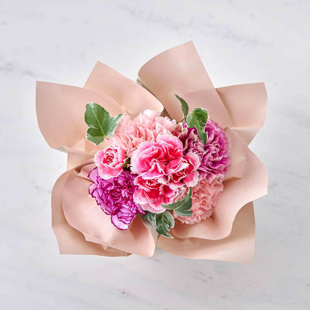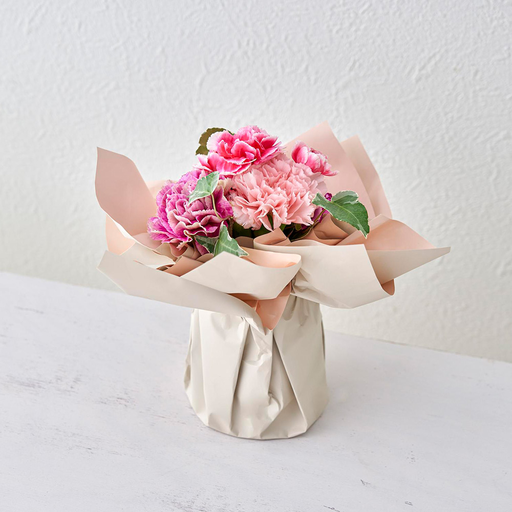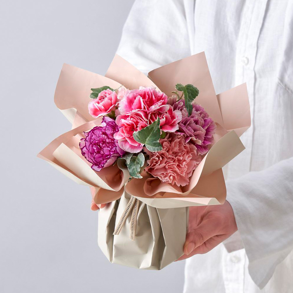 <日比谷花壇>デザイナー西澤真実子さんが特別にデザインしたこのブーケは、優しさに満ちたニュアンスピンクと洗練されたくすみカラーのカーネーションを主役に、柔らかなグリーンでまとめた、トレンド感あふれる上品なカラーリングです。お手入れが簡単な「そのまま飾れるブーケ」なら、受け取ってすぐに癒しとぬくもりを感じる彩りをお部屋に添えていただけます。感謝の気持ちと明るい未来への願いを込めて、特別な花束を贈りませんか。