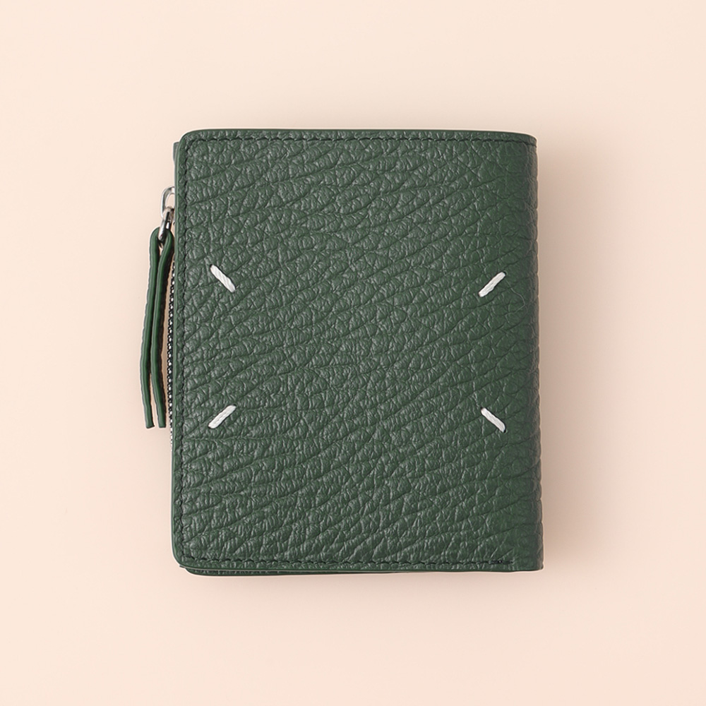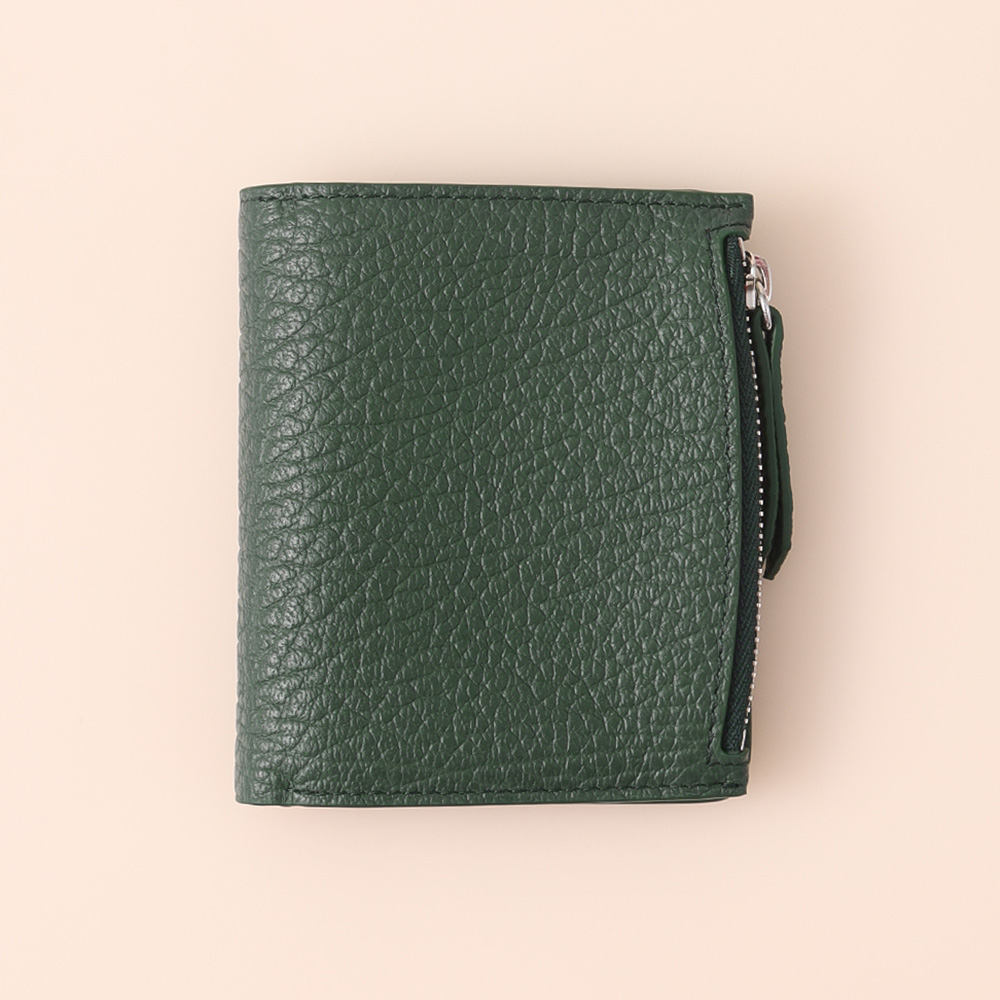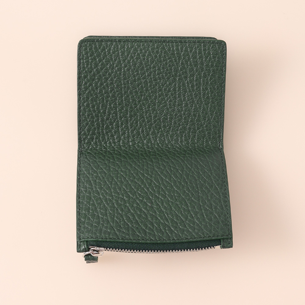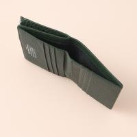 ファスナー付きのセクションとカードホルダーを備えたグレイニーレザー製のレザーフリップフラップ ウォレットです。ロゴがエンボス加工で施されています。