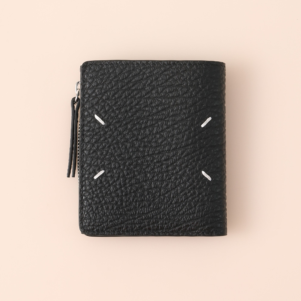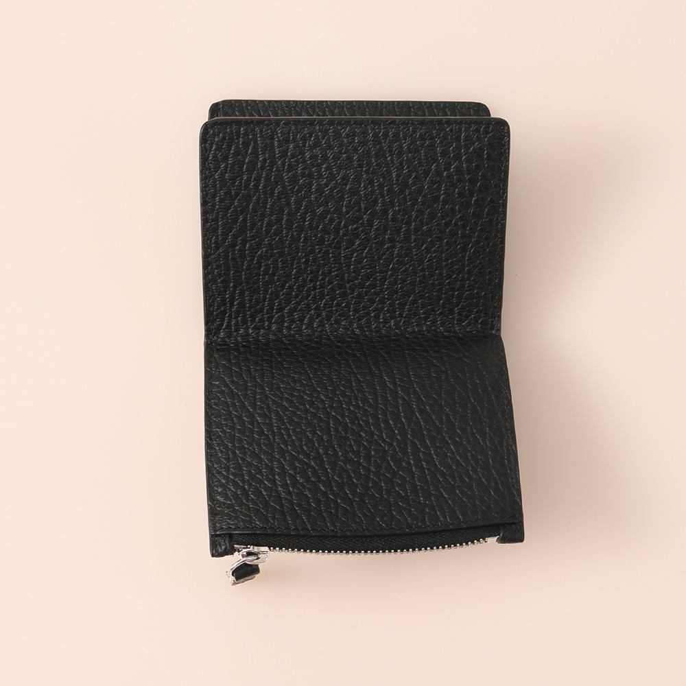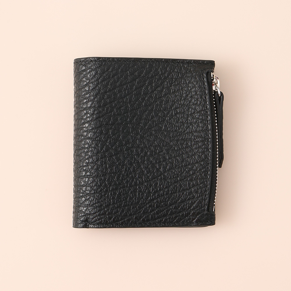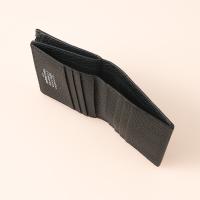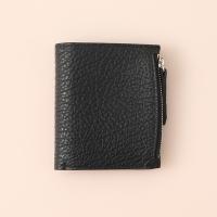 ファスナー付きのセクションとカードホルダーを備えたグレイニーレザー製のレザーフリップフラップ ウォレットです。ロゴがエンボス加工で施されています。