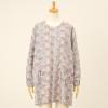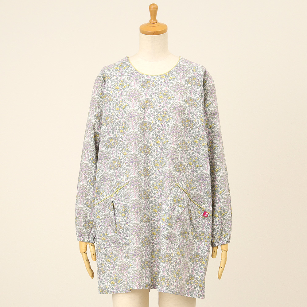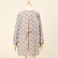 果実と花を咲かせる樹木やぶどうを繰り返しパターンでプリントしたアート感溢れるかっぽう着。ストライプの織りが入ったやや薄手の綿素材を使用しています。