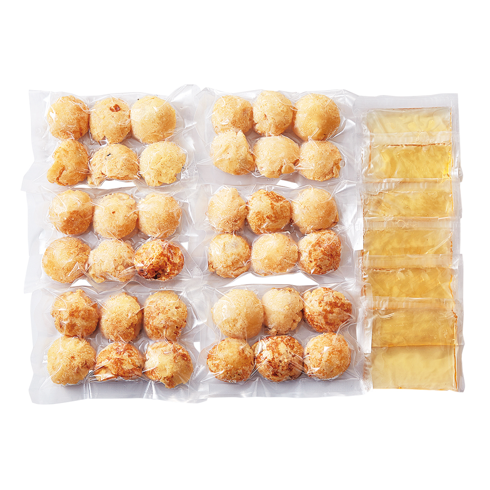 明石産真蛸(明石だこ)と国内産小麦粉を使用。電子レンジで温めるだけで、本場の明石焼が味わえます。
