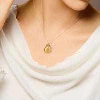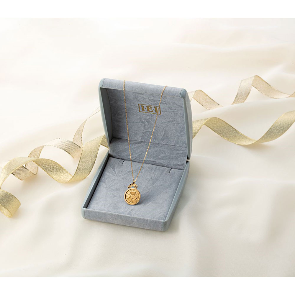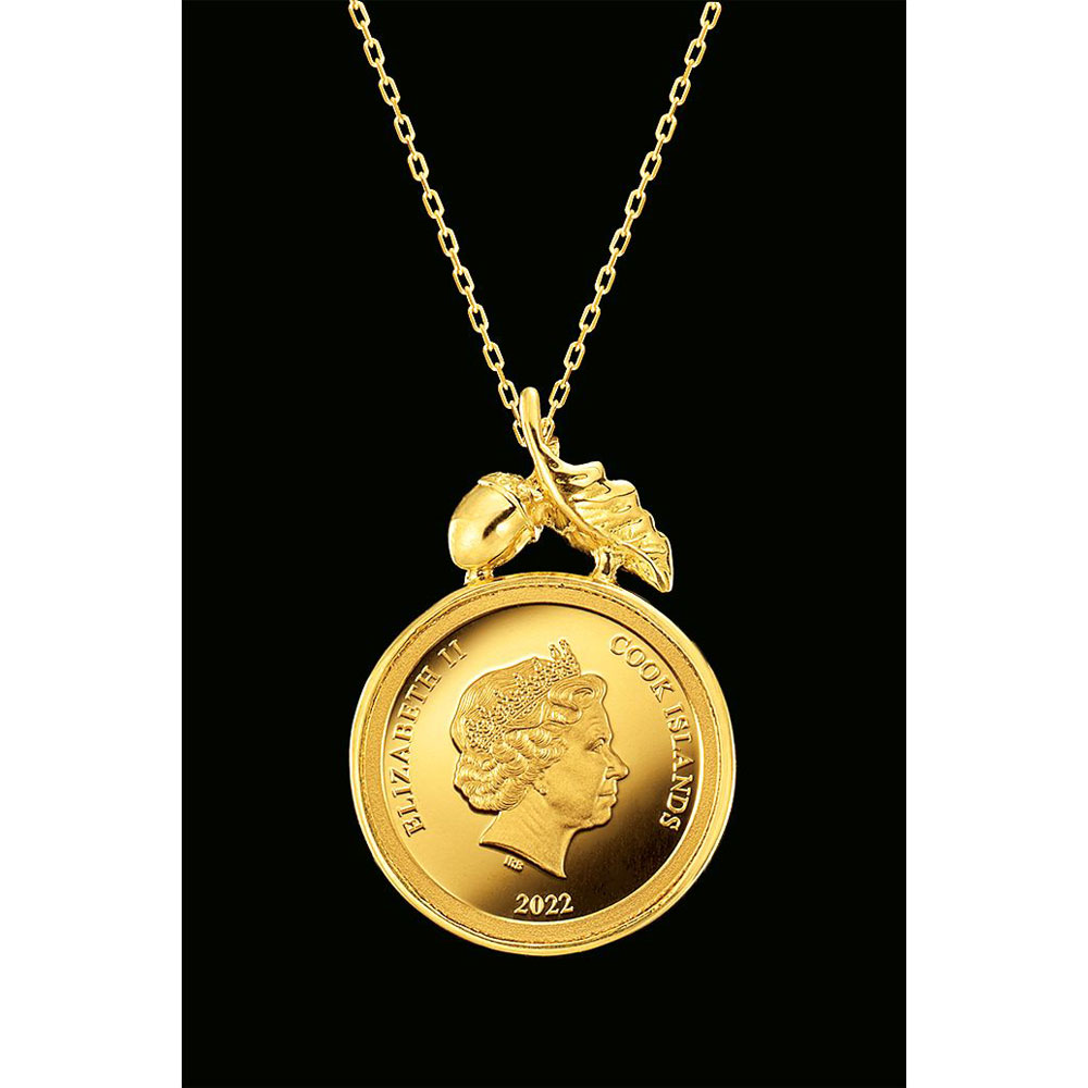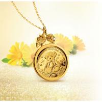 世界中に愛好家をもつ「テディベア」の美しくも価値あるコインペンダント。加工を施すことなく無垢のまま18金のフレームにセットされた品位.9999の特別な金貨には、精妙なレリーフでテディベアの愛らしい姿と、長寿を表すベアの大好物「どんぐり」、生命力の象徴「椎の葉」が描かれ、背景には幸運を招く星が輝いています。