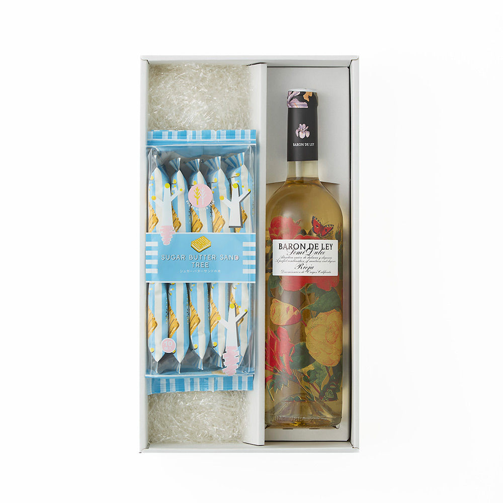 花柄ボトルの白ワインと、バターが広がるバターシリアルスイーツ「シュガーバターサンドの木」を詰め合わせたセットです。