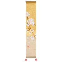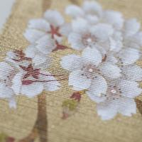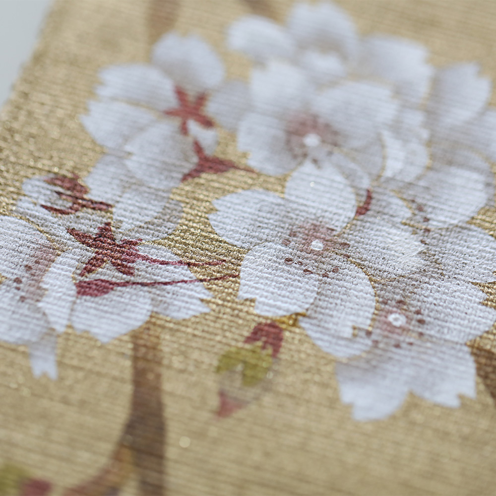 春の日差しの中で咲きこぼれる桜の一枝。待ちわびた桜花爛漫の日に味わえる喜びや楽しさ、あふれるような桜の生命力を感じさせます。2種の色合いの金彩で染め、桜の花を手描き。花びら一枚一枚に繊細なぼかしを入れ、花の柔らかな質感を表現しています。豪華さと上品さを併せ持った見ごたえある一枚です。