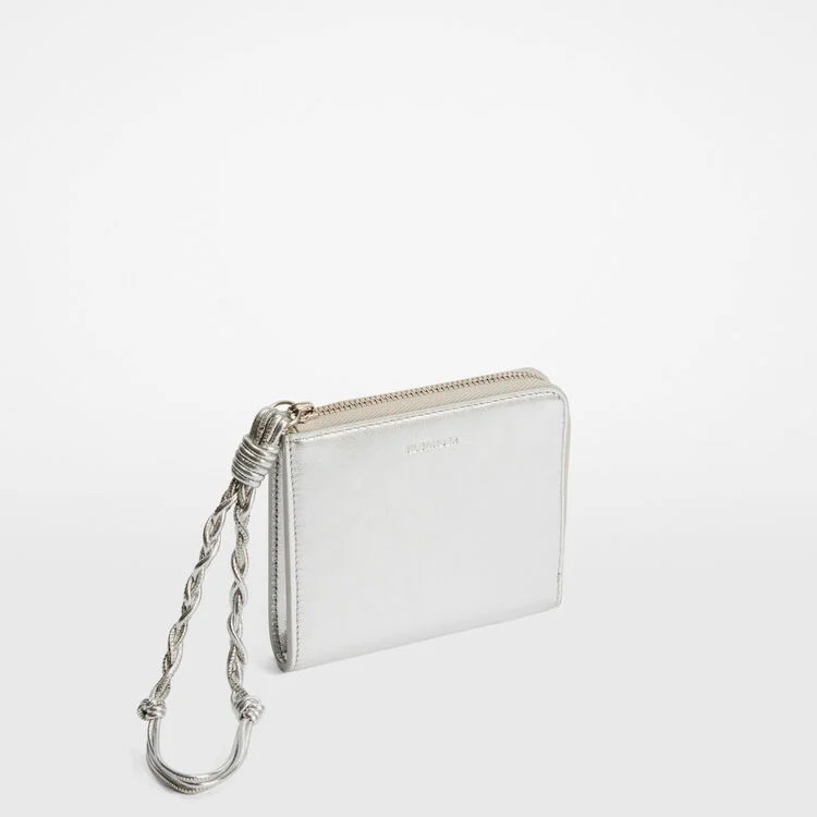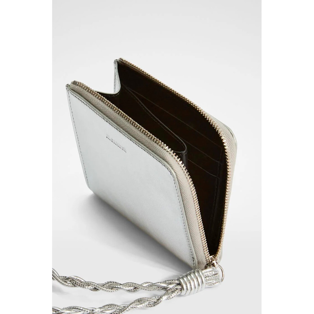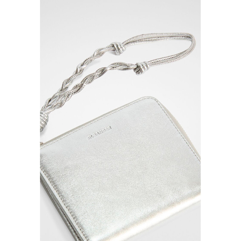 手編みストラップとJil Sanderロゴのエンボス加工が施されたジップ付きラミネートナッパレザークレジットカードパース
